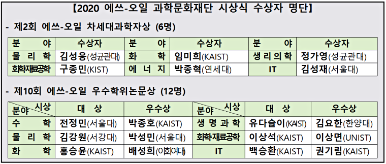 한국과학기술한림원(원장 한민구·이하 한림원)과 한국대학총장협회(이사장 이대순·이하 협회), 에쓰-오일 과학문화재단(이사장 백운규·이하 재단)은 2월 16일(화) 오전 11시 에쓰-오일 본사 강당에서 ‘2020년도 에쓰-오일 과학문화재단 시상식’을 개최했다. 이번 시상식에서는 ‘제2회 에쓰-오일 차세대과학자상’ 수상자 6명과 ‘제10회 에쓰-오일 우수학위논문상’ 수상자 12명 등 총 18명의 수상자에게 상패와 상금을 수여했다.