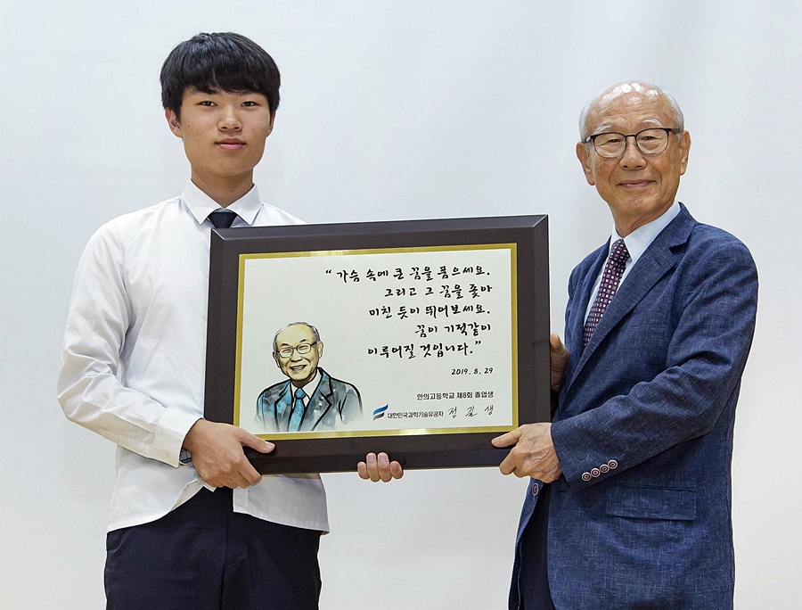 또 정길생 유공자는 후배들에게 전달할 메시지를 현판으로 제작하여 이번 모교 방문 시 기증했다. 현판에는 '가슴 속에 큰 꿈을 품으세요. 그리고 큰 꿈을 좇아 미친 듯이 뛰어보세요. 꿈이 기적같이 이루어질 것입니다.'가 새겨졌다.