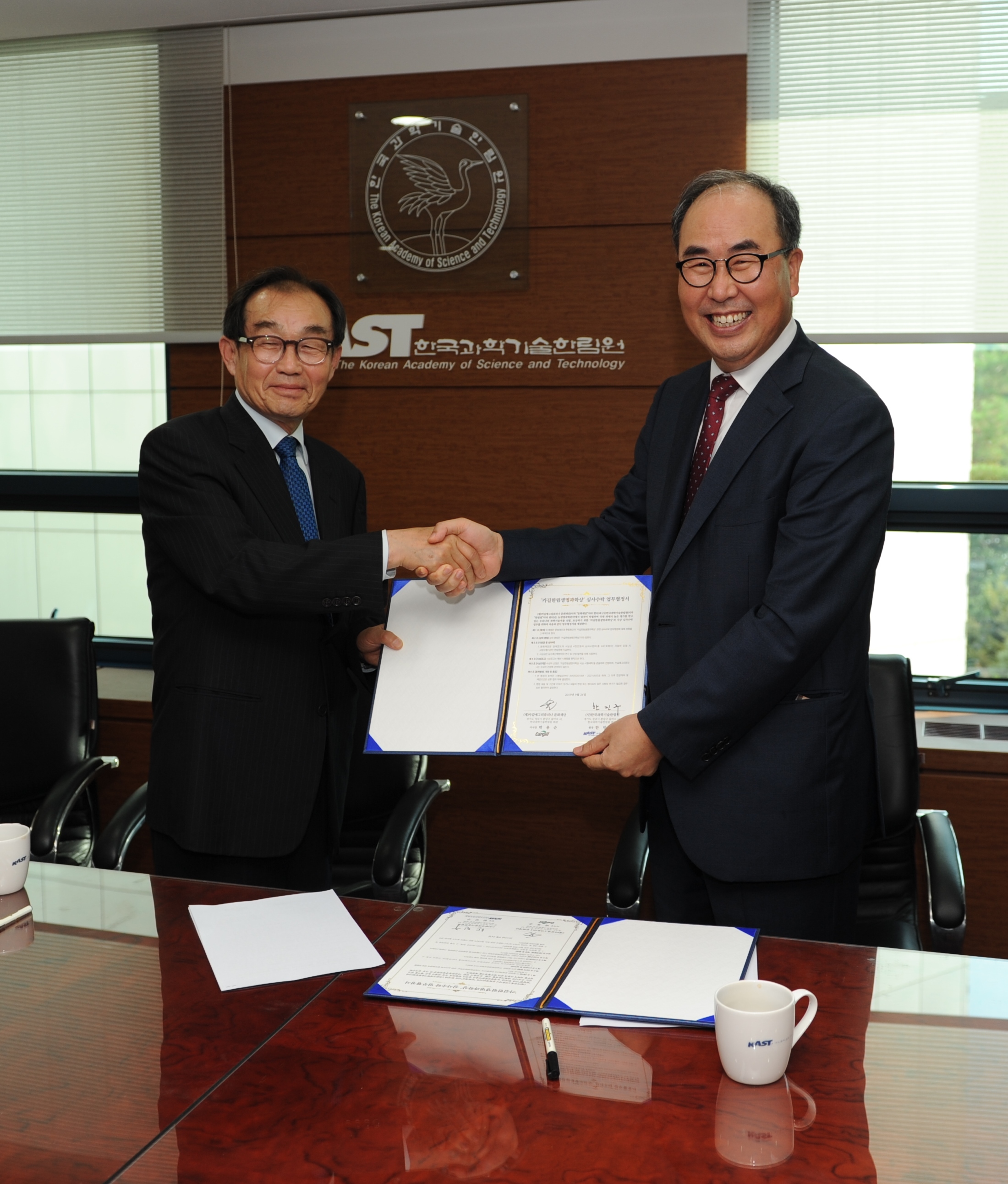 한국과학기술한림원(원장 한민구)과 ㈜카길애그리퓨리나 문화재단(이사장 박용순)은 9월 24일 오후 한림원회관 3층 원장실에서 ‘2019년도 카길한림생명과학상 업무협정서 체결식’을 개최했다.
