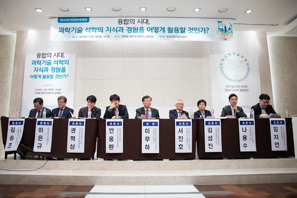 10년 이내 대학 전임교원의 3분의 1이 은퇴 시기를 맞을 것으로 예상되는 가운데 국내 과학기술 고급인력의 부족에 대비하여 장기적이고 체계적인 고경력 과학기술인의 활용방안을 논의하는 자리가 마련됐다. 한국과학기술한림원(원장 한민구·이하 한림원)은 11월 7일 오전 10시 양재동 엘타워 엘하우스홀에서 ‘융합의 시대, 과학기술 석학의 지식과 경험을 어떻게 활용할 것인가?’를 주제로 ‘제144회 한림원탁토론회’를 개최했다.