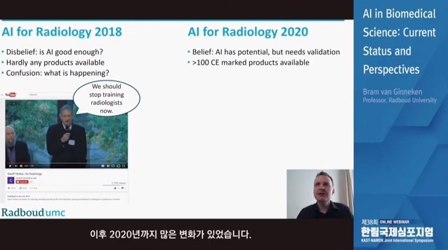 그는 약 10년 후에도 구체적인 작업에 한정된 솔루션을 개발하고 있을 것이라고 예상했다. 특히 기네켄 교수는 의료인공지능기술을 크게 의료진의 역할을 돕는 기술, 의료진을 대체하는 기술, 새로운 의료행위를 창출하는 기술로 분류하고 영상의학분야의 대표적인 예를 소개했다. 기네켄 교수는 “모든 작업에 대해 학습이 가능한 범용 인공지능 시스템 개발은 아직 가시화되지 않았다”며 “앞으로 향상된 도구와 발전된 공학기법을 통해 신속하고 편리하게 개발할 수 있게 되길 기대하고 있다”고 덧붙였다.