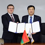 [알렉산더 슈밀린 벨라루스 국가과학기술위원장과 유욱준 총괄부원장이 체결식 후 기념사진을 촬영했다] 우리 한림원과 벨라루스한림원은 지난 11일 한국연구재단(서울)에서 상호협력협약서(MOU)를 체결했다. 체결식에는 유욱준 총괄부원장을 비롯해 최원호 미래창조과학부 국제협력관, 김복철 국가과학기술연구회 정책지원 본부장, 이익찬 국가과학기술연구회 대외협력부장, 김면중 한국연구재단 국제협력센터 유럽협력팀장, 김태희 한‧러 과학기술협력센터 사무국장 등 9인이 참석했다. 벨라루스 대표단 측에서는 알렉산더 슈밀린 벨라루스 과학기술위원장과 세르게이 슈바 국가과학기술위원회 국제과학기술혁신국장을 비롯해 알렉산더 카리니첸코 벨라루스 국립공과대학교 과학혁신 부부총장, 발레리 코즈네미아킨 아톰텍스 사장, 세르게이 필라토프 과학아카..